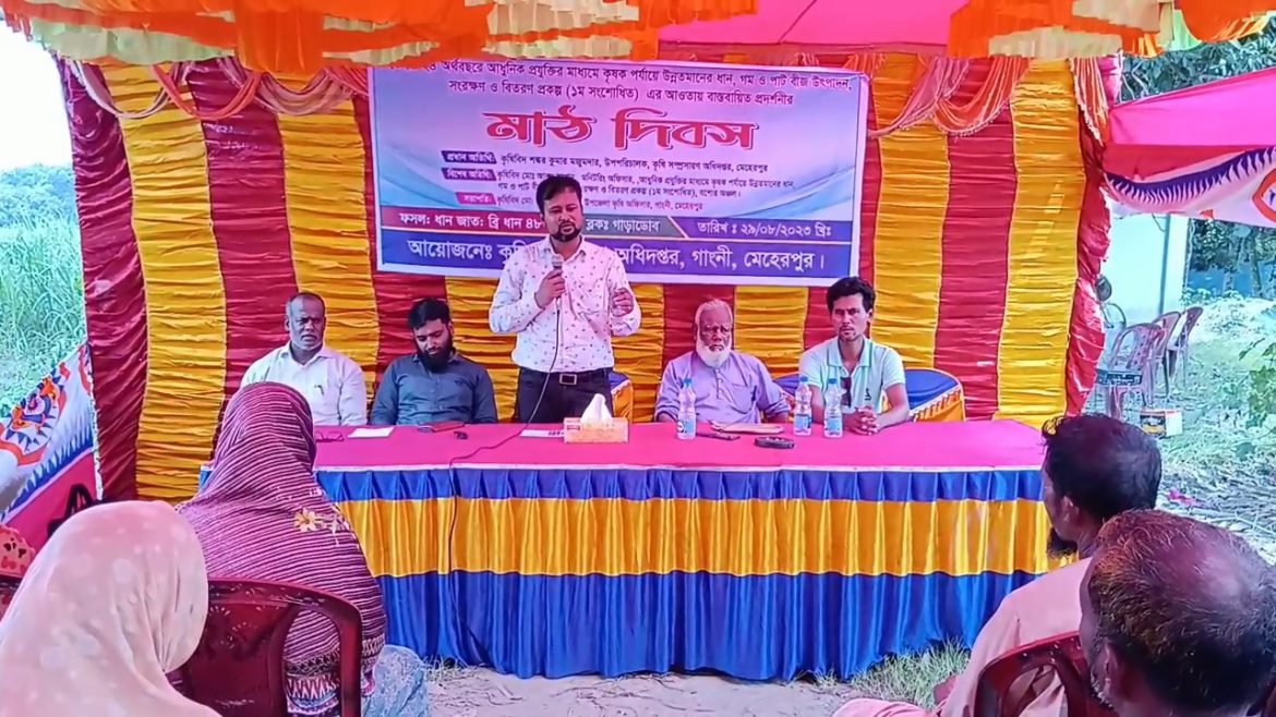 আজিজুল ইসলাম মাস্টারের সভাপতিত্বে প্রধান অতিথি হিসেবে উপস্থিত ছিলেন গাংনী উপজেলা কৃষি কর্মকর্তা ইমরান হোসেন। বিশেষ অতিথী হিসেবে উপস্থিত ছিলেন কৃষি সম্প্রসারণ কর্মকর্তা আব্দুর রউফ, উপসহকারী কৃষি কর্মকর্তা মতিয়ার রহমান,আমিনুল ইসলাম,নাঈমুর রহমান ও স্থানীয় ইউপি সদস্য ফিরোজ হোসেন সহ কৃষক কৃষানীরা উপস্থিত ছিলেন ।