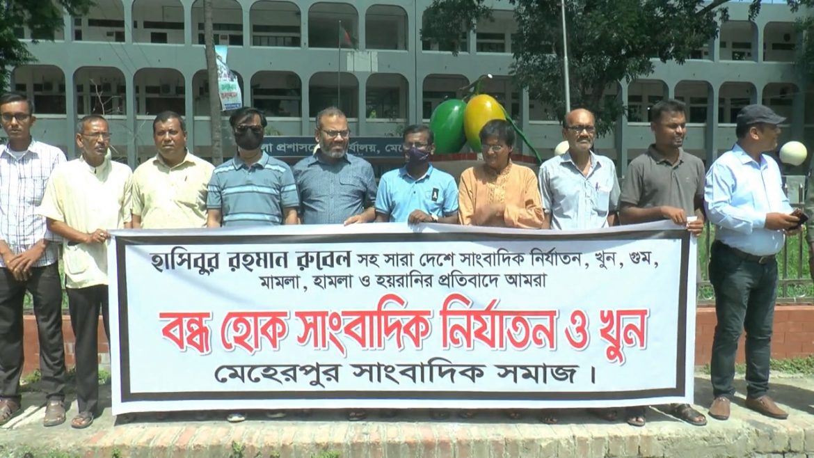 এসব কর্মসূচি পালন করা হয়। পরে সাংবাদিকের আয়োজনে জেলা প্রশাসকের কার্যালয়ের সামনে মানববন্ধন অনুষ্ঠিত হয়। জেলায় কর্মরত সাংবাদিক সমাজের আয়োজনে মানববন্ধনে সাংবাদিক, সুশিল সমাজ, রাজনৈতিক ব্যাক্তি সহ বিভিন্ন শ্রেনী পেশার মানুষ অংশ গ্রহন করে। মানববন্ধনে সভাপতিত্ব করেন মেহেরপুর প্রেসক্লাবের সভাপতি ফারুক হোসেন। বক্তব্য রাখেন মেহেরপুর প্রেসক্লাবের সাধারন সম্পাদক ফজলুল হক মন্টু,সিনিয়র সাংবাদিক তুহিন আরন্য সহ অন্যন্যরা। এসময় বক্তারা সাংবাদিক রুবেল হত্যায় জড়িতদের অনতিবিলম্বে গ্রেপ্তার করে আইনের আওতায় এনে দৃষ্টান্তমূলক শাস্তির দাবি জানান। পরে এ বিষয়ে একটি স্মারকলিপি জেলা প্রশাসকের মাধ্যমে প্রধানমন্ত্রী বরাবর প্রদান করা হয়। উল্লেখ্য, গত ৩ জুলাই রাত ৯টার পর থেকে নিখোঁজ ছিলেন কুষ্টিয়া জেলা রিপোর্টার্স ক্লাবের সাধারণ সম্পাদক, স্থানীয় দৈনিক কুষ্টিয়ার খবর পত্রিকার ভারপ্রাপ্ত সম্পাদক, দৈনিক আমাদের নতুন সময় পত্রিকার কুষ্টিয়া জেলা প্রতিনিধি হাসিবুর রহমান রুবেল। নিখোঁজের পাঁচদিন পর ৭ জুলাই দুপুরে কুমারখালীর গড়াই নদী থেকে তাঁর মরদেহ উদ্ধার করে পুলিশ।